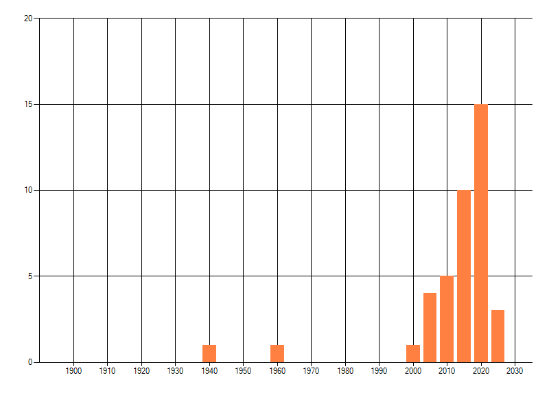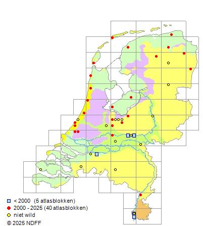 Het aantal atlasblokken (5x5 km) waarin de soort is gemeld binnen een periode van vijf jaar (vanaf 1980) of twintig jaar. Niet gecorrigeerd voor waarnemersinspanning en het aantal doorgegeven waarnemingen kan sterk variëren per periode, dus een trend in verspreiding kan hier niet direct uit worden afgelezen. Het opgegeven jaartal is het eerste jaar van de periode. Bron: gevalideerde waarnemingen uit de NDFF.