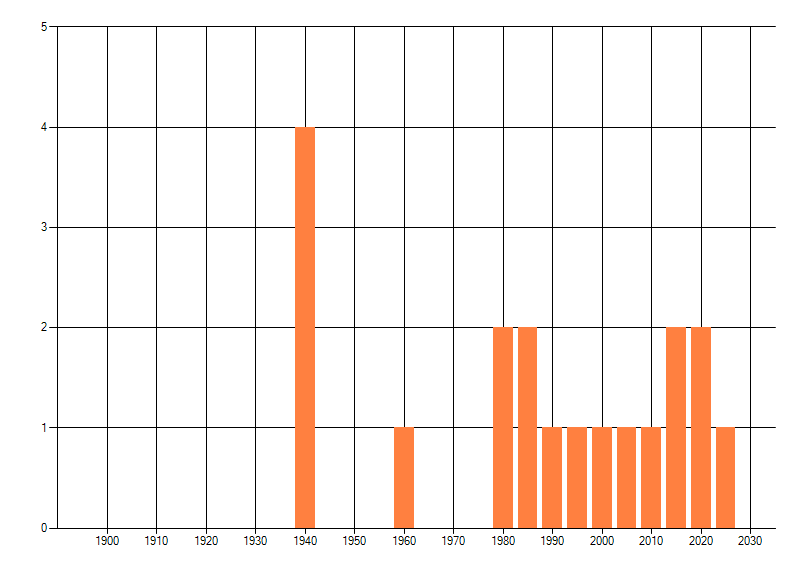 Het aantal atlasblokken (5x5 km) waarin de soort is gemeld binnen een periode van vijf jaar (vanaf 1980) of twintig jaar. Niet gecorrigeerd voor waarnemersinspanning en het aantal doorgegeven waarnemingen kan sterk variëren per periode, dus een trend in verspreiding kan hier niet direct uit worden afgelezen. Het opgegeven jaartal is het eerste jaar van de periode. Bron: gevalideerde waarnemingen uit de NDFF.