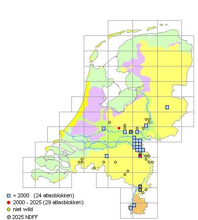CC BY-NC-SA 3.0 NLVerspreidingNederlandVroeger zeer zeldzaam in het rivierengebied in het oosten van het land en in Zuid-Limburg. Voor het laatst gevonden in 1935 bij Nijmegen. Nu weer zeer zeldzaam in het oosten van Noord-Brabant.