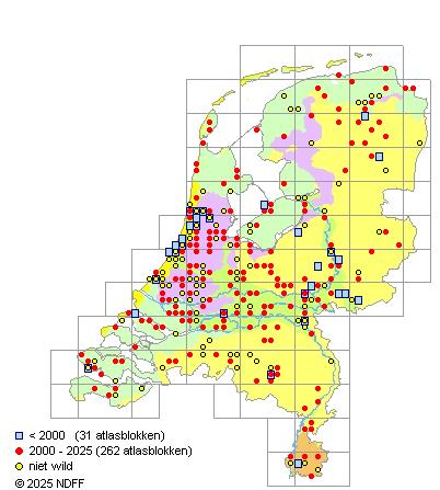 Het aantal atlasblokken (5x5 km) waarin de soort is gemeld binnen een periode van vijf jaar (vanaf 1980) of twintig jaar. Niet gecorrigeerd voor waarnemersinspanning en het aantal doorgegeven waarnemingen kan sterk variëren per periode, dus een trend in verspreiding kan hier niet direct uit worden afgelezen. Het opgegeven jaartal is het eerste jaar van de periode. Bron: gevalideerde waarnemingen uit de NDFF.