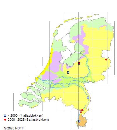 Het aantal atlasblokken (5x5 km) waarin de soort is gemeld binnen een periode van vijf jaar (vanaf 1980) of twintig jaar. Niet gecorrigeerd voor waarnemersinspanning en het aantal doorgegeven waarnemingen kan sterk variëren per periode, dus een trend in verspreiding kan hier niet direct uit worden afgelezen. Het opgegeven jaartal is het eerste jaar van de periode. Bron: gevalideerde waarnemingen uit de NDFF.