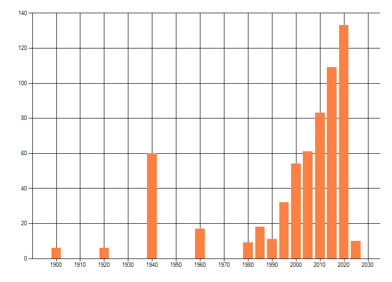 Het aantal atlasblokken (5x5 km) waarin de soort is gemeld binnen een periode van vijf jaar (vanaf 1980) of twintig jaar. Niet gecorrigeerd voor waarnemersinspanning en het aantal doorgegeven waarnemingen kan sterk variëren per periode, dus een trend in verspreiding kan hier niet direct uit worden afgelezen. Het opgegeven jaartal is het eerste jaar van de periode. Bron: gevalideerde waarnemingen uit de NDFF.