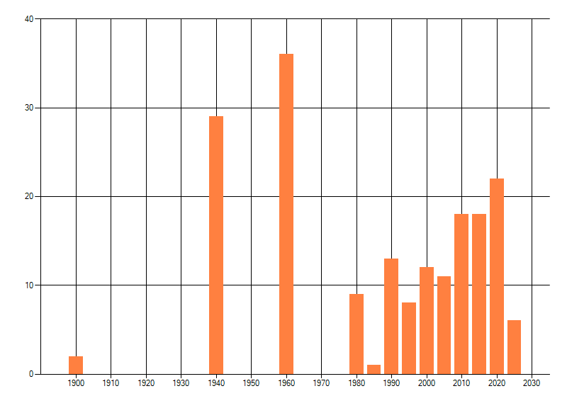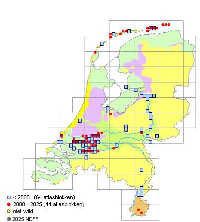 Het aantal atlasblokken (5x5 km) waarin de soort is gemeld binnen een periode van vijf jaar (vanaf 1980) of twintig jaar. Niet gecorrigeerd voor waarnemersinspanning en het aantal doorgegeven waarnemingen kan sterk variëren per periode, dus een trend in verspreiding kan hier niet direct uit worden afgelezen. Het opgegeven jaartal is het eerste jaar van de periode. Bron: gevalideerde waarnemingen uit de NDFF.