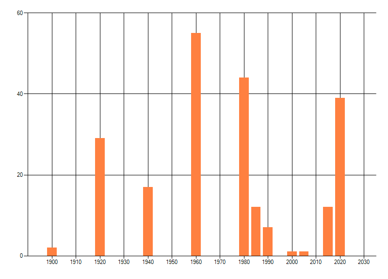 Het aantal atlasblokken (5x5 km) waarin de soort is gemeld binnen een periode van vijf jaar (vanaf 1980) of twintig jaar. Niet gecorrigeerd voor waarnemersinspanning en het aantal doorgegeven waarnemingen kan sterk variëren per periode, dus een trend in verspreiding kan hier niet direct uit worden afgelezen. Het opgegeven jaartal is het eerste jaar van de periode. Bron: gevalideerde waarnemingen uit de NDFF.