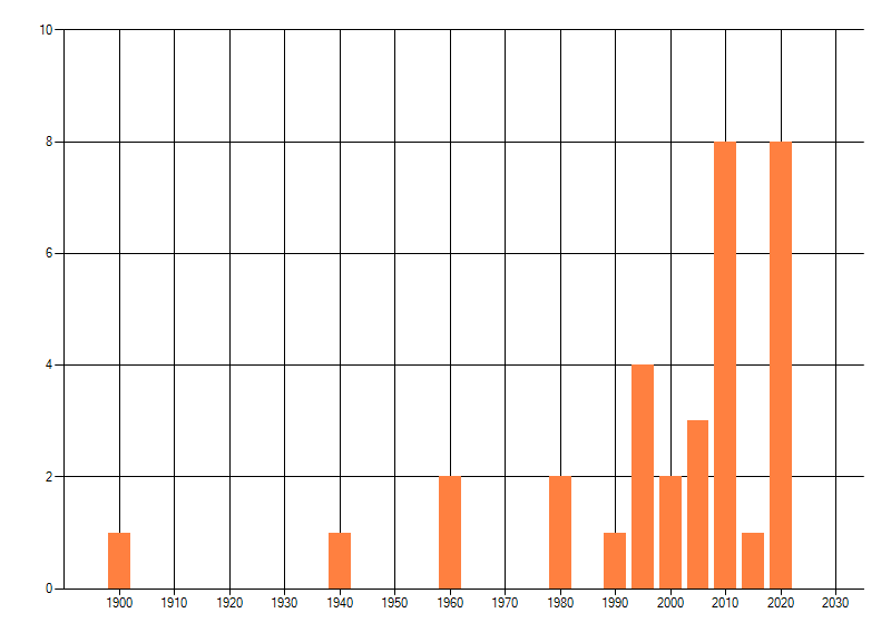 Het aantal atlasblokken (5x5 km) waarin de soort is gemeld binnen een periode van vijf jaar (vanaf 1980) of twintig jaar. Niet gecorrigeerd voor waarnemersinspanning en het aantal doorgegeven waarnemingen kan sterk variëren per periode, dus een trend in verspreiding kan hier niet direct uit worden afgelezen. Het opgegeven jaartal is het eerste jaar van de periode. Bron: gevalideerde waarnemingen uit de NDFF.
