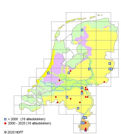 Het aantal atlasblokken (5x5 km) waarin de soort is gemeld binnen een periode van vijf jaar (vanaf 1980) of twintig jaar. Niet gecorrigeerd voor waarnemersinspanning en het aantal doorgegeven waarnemingen kan sterk variëren per periode, dus een trend in verspreiding kan hier niet direct uit worden afgelezen. Het opgegeven jaartal is het eerste jaar van de periode. Bron: gevalideerde waarnemingen uit de NDFF.