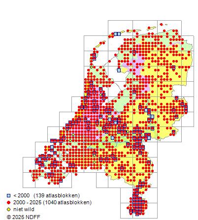 CC BY-NC-SA 3.0 NLVerspreidingNederlandVrij algemeen in stedelijke gebieden en zeldzaam in de Hollandse en Zeeuwse duinen, in het rivierengebied en in Zuid-Limburg. Elders zeer zeldzaam.