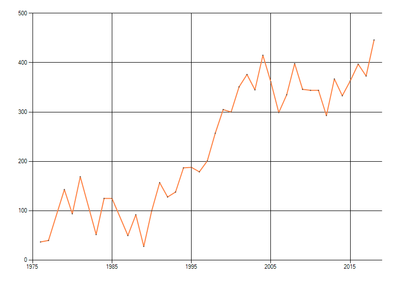 In de grafiek correspondeert ieder punt met het laatste jaar van zo'n periode.