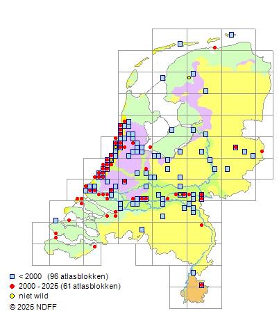 Het aantal atlasblokken (5x5 km) waarin de soort is gemeld binnen een periode van vijf jaar (vanaf 1980) of twintig jaar. Niet gecorrigeerd voor waarnemersinspanning en het aantal doorgegeven waarnemingen kan sterk variëren per periode, dus een trend in verspreiding kan hier niet direct uit worden afgelezen. Het opgegeven jaartal is het eerste jaar van de periode. Bron: gevalideerde waarnemingen uit de NDFF.