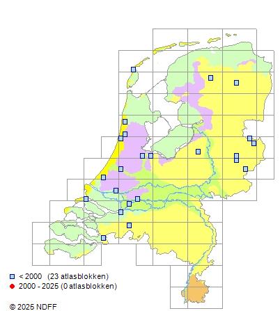 Het aantal atlasblokken (5x5 km) waarin de soort is gemeld binnen een periode van vijf jaar (vanaf 1980) of twintig jaar. Niet gecorrigeerd voor waarnemersinspanning en het aantal doorgegeven waarnemingen kan sterk variëren per periode, dus een trend in verspreiding kan hier niet direct uit worden afgelezen. Het opgegeven jaartal is het eerste jaar van de periode. Bron: gevalideerde waarnemingen uit de NDFF.