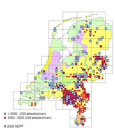 Het aantal atlasblokken (5x5 km) waarin de soort is gemeld binnen een periode van vijf jaar (vanaf 1980) of twintig jaar. Niet gecorrigeerd voor waarnemersinspanning en het aantal doorgegeven waarnemingen kan sterk variëren per periode, dus een trend in verspreiding kan hier niet direct uit worden afgelezen. Het opgegeven jaartal is het eerste jaar van de periode. Bron: gevalideerde waarnemingen uit de NDFF.
