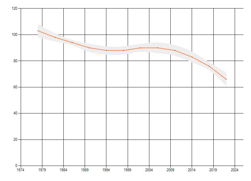 Gemiddelde trend van het aantal kilometerhokken waarin de soort voorkomt, weergegeven als indexcijfer (1975-1978 = 100).