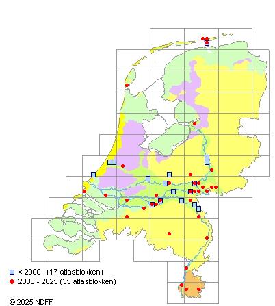 Het aantal atlasblokken (5x5 km) waarin de soort is gemeld binnen een periode van vijf jaar (vanaf 1980) of twintig jaar. Niet gecorrigeerd voor waarnemersinspanning en het aantal doorgegeven waarnemingen kan sterk variëren per periode, dus een trend in verspreiding kan hier niet direct uit worden afgelezen. Het opgegeven jaartal is het eerste jaar van de periode. Bron: gevalideerde waarnemingen uit de NDFF.