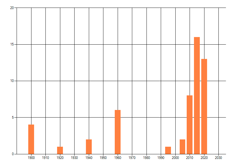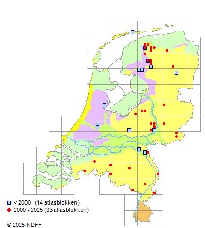 Het aantal atlasblokken (5x5 km) waarin de soort is gemeld binnen een periode van vijf jaar (vanaf 1980) of twintig jaar. Niet gecorrigeerd voor waarnemersinspanning en het aantal doorgegeven waarnemingen kan sterk variëren per periode, dus een trend in verspreiding kan hier niet direct uit worden afgelezen. Het opgegeven jaartal is het eerste jaar van de periode. Bron: gevalideerde waarnemingen uit de NDFF.