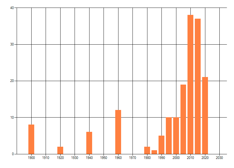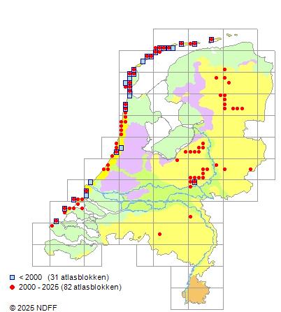 Het aantal atlasblokken (5x5 km) waarin de soort is gemeld binnen een periode van vijf jaar (vanaf 1980) of twintig jaar. Niet gecorrigeerd voor waarnemersinspanning en het aantal doorgegeven waarnemingen kan sterk variëren per periode, dus een trend in verspreiding kan hier niet direct uit worden afgelezen. Het opgegeven jaartal is het eerste jaar van de periode. Bron: gevalideerde waarnemingen uit de NDFF.