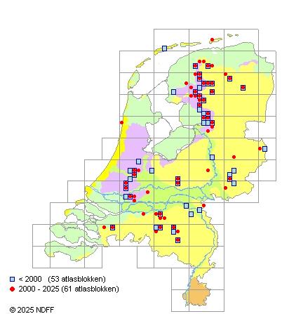 Het aantal atlasblokken (5x5 km) waarin de soort is gemeld binnen een periode van vijf jaar (vanaf 1980) of twintig jaar. Niet gecorrigeerd voor waarnemersinspanning en het aantal doorgegeven waarnemingen kan sterk variëren per periode, dus een trend in verspreiding kan hier niet direct uit worden afgelezen. Het opgegeven jaartal is het eerste jaar van de periode. Bron: gevalideerde waarnemingen uit de NDFF.