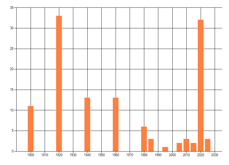 Het aantal atlasblokken (5x5 km) waarin de soort is gemeld binnen een periode van vijf jaar (vanaf 1980) of twintig jaar. Niet gecorrigeerd voor waarnemersinspanning en het aantal doorgegeven waarnemingen kan sterk variëren per periode, dus een trend in verspreiding kan hier niet direct uit worden afgelezen. Het opgegeven jaartal is het eerste jaar van de periode. Bron: gevalideerde waarnemingen uit de NDFF.