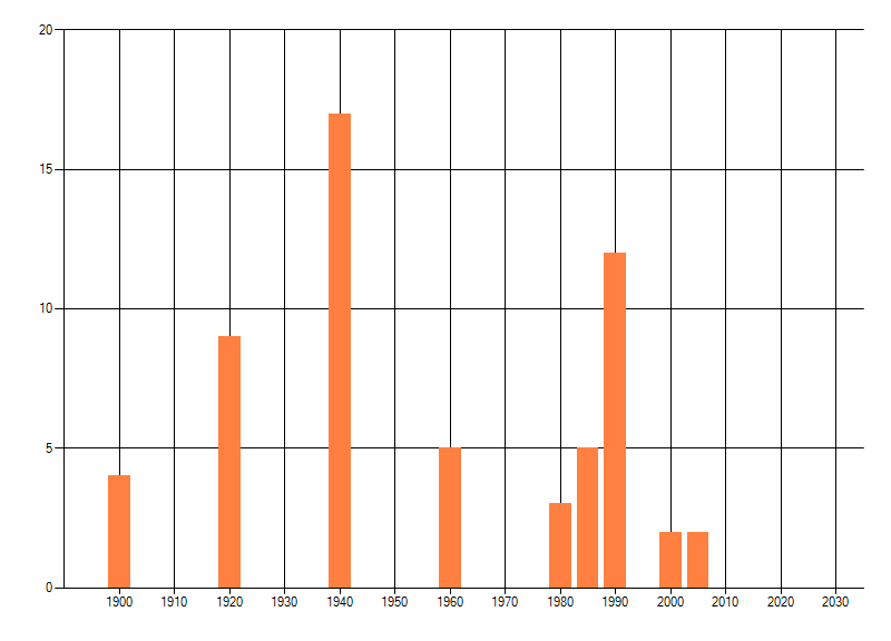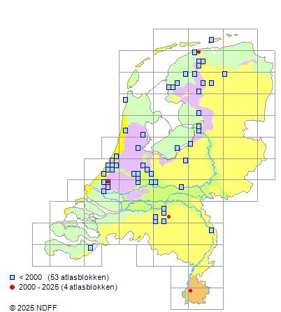 Het aantal atlasblokken (5x5 km) waarin de soort is gemeld binnen een periode van vijf jaar (vanaf 1980) of twintig jaar. Niet gecorrigeerd voor waarnemersinspanning en het aantal doorgegeven waarnemingen kan sterk variëren per periode, dus een trend in verspreiding kan hier niet direct uit worden afgelezen. Het opgegeven jaartal is het eerste jaar van de periode. Bron: gevalideerde waarnemingen uit de NDFF.