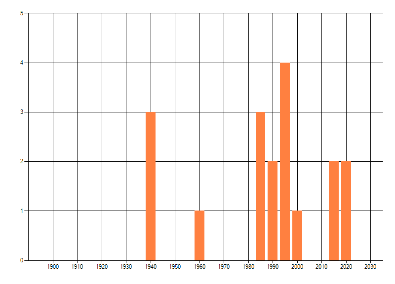 Het aantal atlasblokken (5x5 km) waarin de soort is gemeld binnen een periode van vijf jaar (vanaf 1980) of twintig jaar. Niet gecorrigeerd voor waarnemersinspanning en het aantal doorgegeven waarnemingen kan sterk variëren per periode, dus een trend in verspreiding kan hier niet direct uit worden afgelezen. Het opgegeven jaartal is het eerste jaar van de periode. Bron: gevalideerde waarnemingen uit de NDFF.