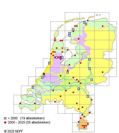 Het aantal atlasblokken (5x5 km) waarin de soort is gemeld binnen een periode van vijf jaar (vanaf 1980) of twintig jaar. Niet gecorrigeerd voor waarnemersinspanning en het aantal doorgegeven waarnemingen kan sterk variëren per periode, dus een trend in verspreiding kan hier niet direct uit worden afgelezen. Het opgegeven jaartal is het eerste jaar van de periode. Bron: gevalideerde waarnemingen uit de NDFF.