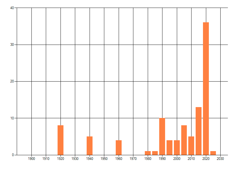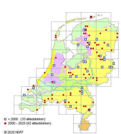 Het aantal atlasblokken (5x5 km) waarin de soort is gemeld binnen een periode van vijf jaar (vanaf 1980) of twintig jaar. Niet gecorrigeerd voor waarnemersinspanning en het aantal doorgegeven waarnemingen kan sterk variëren per periode, dus een trend in verspreiding kan hier niet direct uit worden afgelezen. Het opgegeven jaartal is het eerste jaar van de periode. Bron: gevalideerde waarnemingen uit de NDFF.