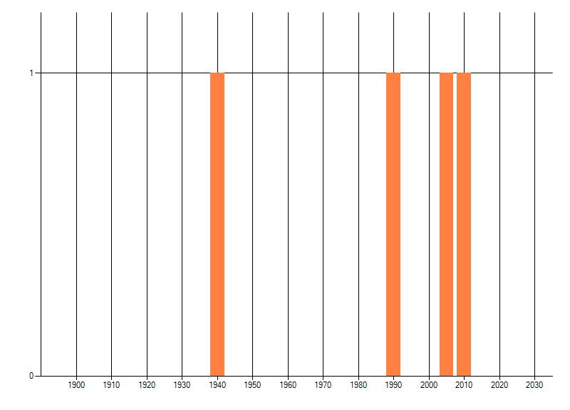 Het aantal atlasblokken (5x5 km) waarin de soort is gemeld binnen een periode van vijf jaar (vanaf 1980) of twintig jaar. Niet gecorrigeerd voor waarnemersinspanning en het aantal doorgegeven waarnemingen kan sterk variëren per periode, dus een trend in verspreiding kan hier niet direct uit worden afgelezen. Het opgegeven jaartal is het eerste jaar van de periode. Bron: gevalideerde waarnemingen uit de NDFF.
