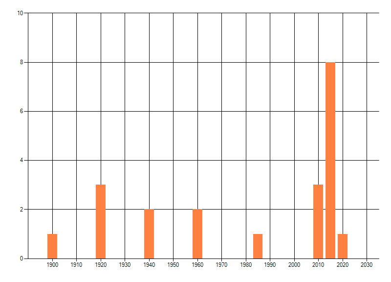 Het aantal atlasblokken (5x5 km) waarin de soort is gemeld binnen een periode van vijf jaar (vanaf 1980) of twintig jaar. Niet gecorrigeerd voor waarnemersinspanning en het aantal doorgegeven waarnemingen kan sterk variëren per periode, dus een trend in verspreiding kan hier niet direct uit worden afgelezen. Het opgegeven jaartal is het eerste jaar van de periode. Bron: gevalideerde waarnemingen uit de NDFF.