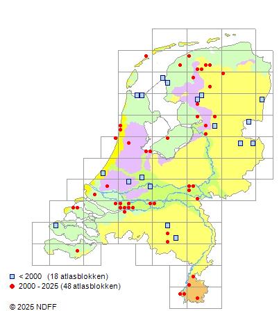 Het aantal atlasblokken (5x5 km) waarin de soort is gemeld binnen een periode van vijf jaar (vanaf 1980) of twintig jaar. Niet gecorrigeerd voor waarnemersinspanning en het aantal doorgegeven waarnemingen kan sterk variëren per periode, dus een trend in verspreiding kan hier niet direct uit worden afgelezen. Het opgegeven jaartal is het eerste jaar van de periode. Bron: gevalideerde waarnemingen uit de NDFF.