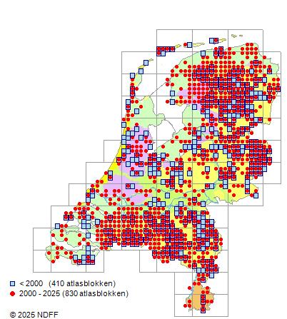 Het aantal atlasblokken (5x5 km) waarin de soort is gemeld binnen een periode van vijf jaar (vanaf 1980) of twintig jaar. Niet gecorrigeerd voor waarnemersinspanning en het aantal doorgegeven waarnemingen kan sterk variëren per periode, dus een trend in verspreiding kan hier niet direct uit worden afgelezen. Het opgegeven jaartal is het eerste jaar van de periode. Bron: gevalideerde waarnemingen uit de NDFF.