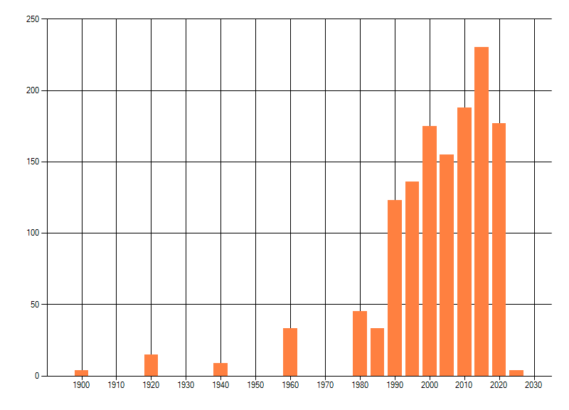 Het aantal atlasblokken (5x5 km) waarin de soort is gemeld binnen een periode van vijf jaar (vanaf 1980) of twintig jaar. Niet gecorrigeerd voor waarnemersinspanning en het aantal doorgegeven waarnemingen kan sterk variëren per periode, dus een trend in verspreiding kan hier niet direct uit worden afgelezen. Het opgegeven jaartal is het eerste jaar van de periode. Bron: gevalideerde waarnemingen uit de NDFF.