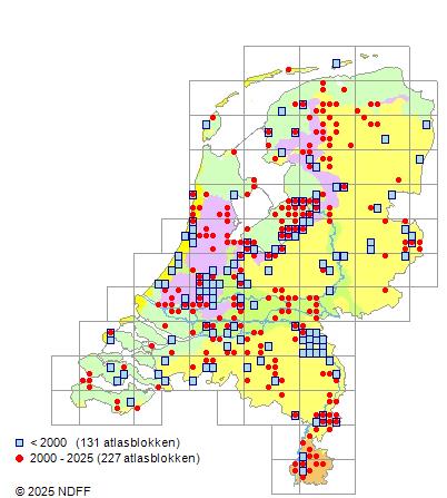 Het aantal atlasblokken (5x5 km) waarin de soort is gemeld binnen een periode van vijf jaar (vanaf 1980) of twintig jaar. Niet gecorrigeerd voor waarnemersinspanning en het aantal doorgegeven waarnemingen kan sterk variëren per periode, dus een trend in verspreiding kan hier niet direct uit worden afgelezen. Het opgegeven jaartal is het eerste jaar van de periode. Bron: gevalideerde waarnemingen uit de NDFF.