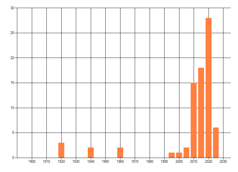 Het aantal atlasblokken (5x5 km) waarin de soort is gemeld binnen een periode van vijf jaar (vanaf 1980) of twintig jaar. Niet gecorrigeerd voor waarnemersinspanning en het aantal doorgegeven waarnemingen kan sterk variëren per periode, dus een trend in verspreiding kan hier niet direct uit worden afgelezen. Het opgegeven jaartal is het eerste jaar van de periode. Bron: gevalideerde waarnemingen uit de NDFF.