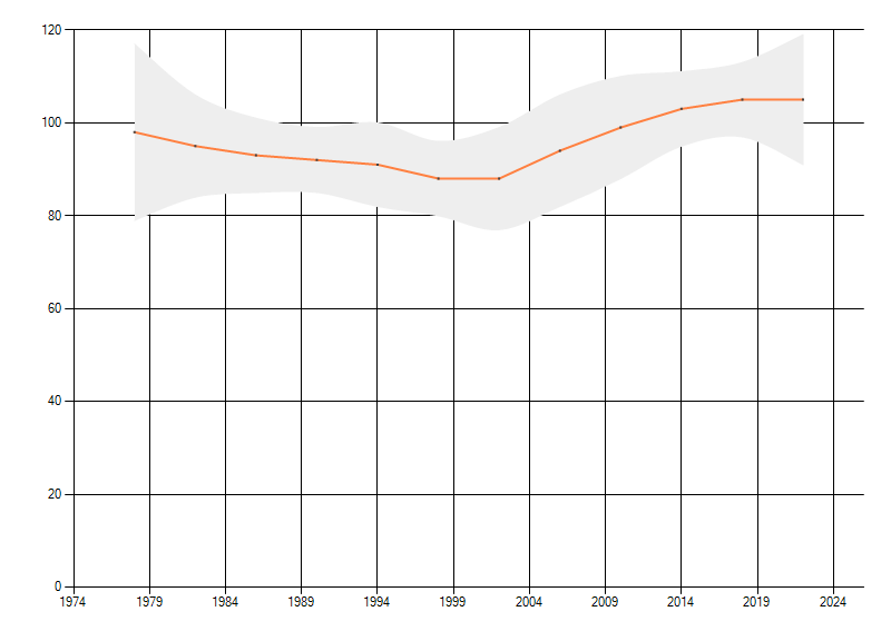 Gemiddelde trend van het aantal kilometerhokken waarin de soort voorkomt, weergegeven als indexcijfer (1975-1978 = 100).