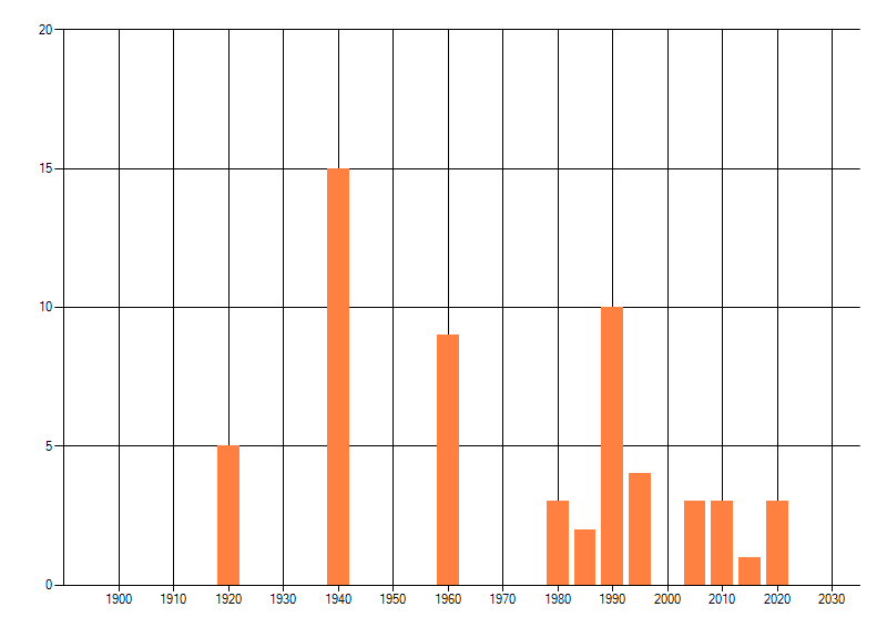 Het aantal atlasblokken (5x5 km) waarin de soort is gemeld binnen een periode van vijf jaar (vanaf 1980) of twintig jaar. Niet gecorrigeerd voor waarnemersinspanning en het aantal doorgegeven waarnemingen kan sterk variëren per periode, dus een trend in verspreiding kan hier niet direct uit worden afgelezen. Het opgegeven jaartal is het eerste jaar van de periode. Bron: gevalideerde waarnemingen uit de NDFF.