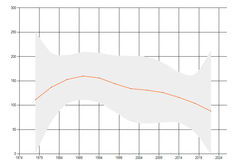 Gemiddelde trend van het aantal kilometerhokken waarin de soort voorkomt, weergegeven als indexcijfer (1975-1978 = 100). De trend is gecorrigeerd voor waarnemersinspanning en geeft de relatieve verandering in het aantal bezette kilometerhokken weer. Voor de berekening worden de data per periode van vier jaar samengenomen. In de grafiek correspondeert ieder punt met het laatste jaar van zo'n periode.