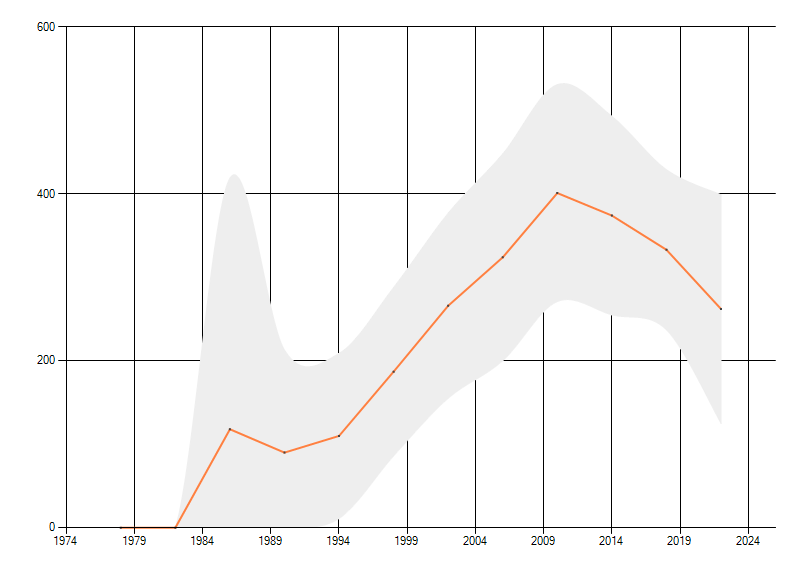 Gemiddelde trend van het aantal kilometerhokken waarin de soort voorkomt, weergegeven als indexcijfer (1975-1978 = 100). De trend is gecorrigeerd voor waarnemersinspanning en geeft de relatieve verandering in het aantal bezette kilometerhokken weer. Voor de berekening worden de data per periode van vier jaar samengenomen. In de grafiek correspondeert ieder punt met het laatste jaar van zo'n periode.