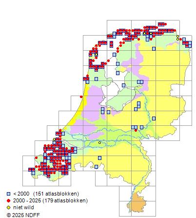 Het aantal atlasblokken (5x5 km) waarin de soort is gemeld binnen een periode van vijf jaar (vanaf 1980) of twintig jaar. Niet gecorrigeerd voor waarnemersinspanning en het aantal doorgegeven waarnemingen kan sterk variƫren per periode, dus een trend in verspreiding kan hier niet direct uit worden afgelezen. Het opgegeven jaartal is het eerste jaar van de periode. Bron: gevalideerde waarnemingen uit de NDFF.