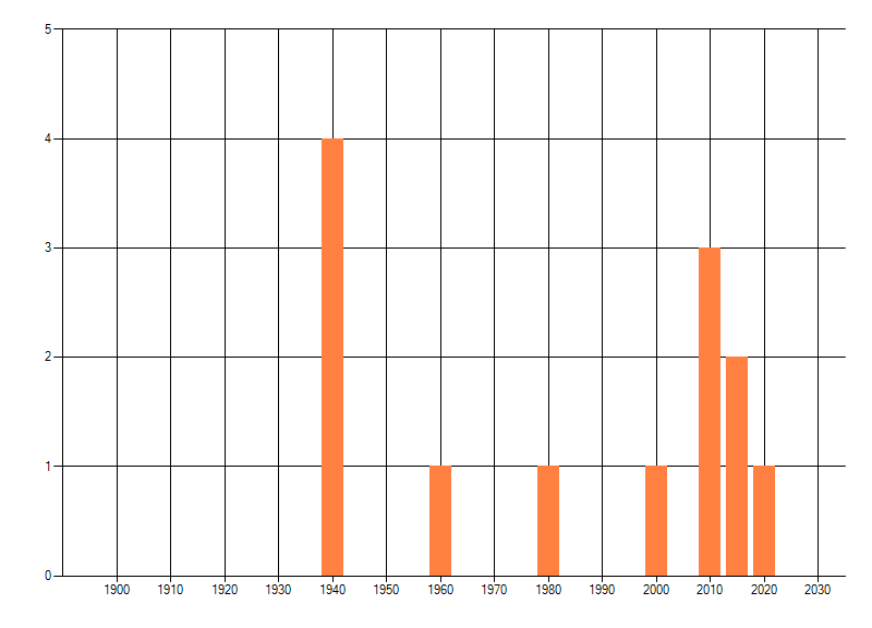 Het aantal atlasblokken (5x5 km) waarin de soort is gemeld binnen een periode van vijf jaar (vanaf 1980) of twintig jaar. Niet gecorrigeerd voor waarnemersinspanning en het aantal doorgegeven waarnemingen kan sterk variëren per periode, dus een trend in verspreiding kan hier niet direct uit worden afgelezen. Het opgegeven jaartal is het eerste jaar van de periode. Bron: gevalideerde waarnemingen uit de NDFF.