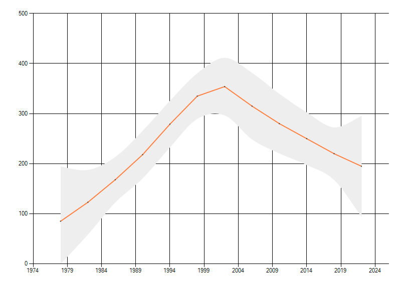 Gemiddelde trend van het aantal kilometerhokken waarin de soort voorkomt, weergegeven als indexcijfer (1975-1978 = 100).