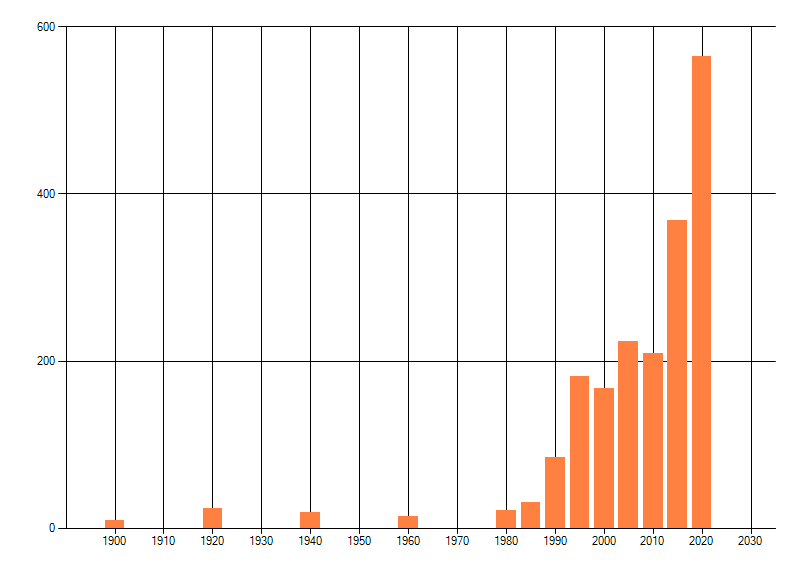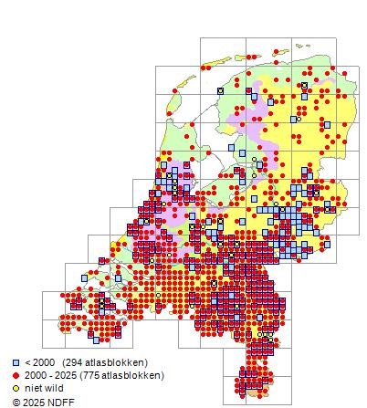 Het aantal atlasblokken (5x5 km) waarin de soort is gemeld binnen een periode van vijf jaar (vanaf 1980) of twintig jaar. Niet gecorrigeerd voor waarnemersinspanning en het aantal doorgegeven waarnemingen kan sterk variëren per periode, dus een trend in verspreiding kan hier niet direct uit worden afgelezen. Het opgegeven jaartal is het eerste jaar van de periode. Bron: gevalideerde waarnemingen uit de NDFF.