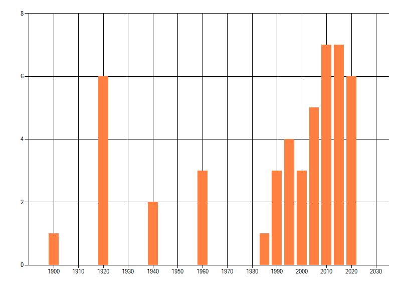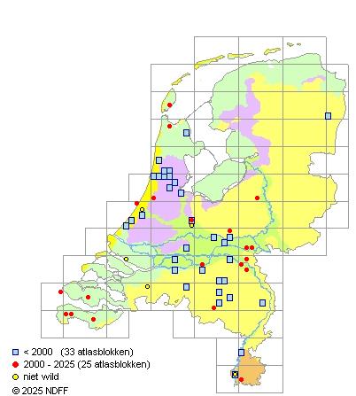 Het aantal atlasblokken (5x5 km) waarin de soort is gemeld binnen een periode van vijf jaar (vanaf 1980) of twintig jaar. Niet gecorrigeerd voor waarnemersinspanning en het aantal doorgegeven waarnemingen kan sterk variëren per periode, dus een trend in verspreiding kan hier niet direct uit worden afgelezen. Het opgegeven jaartal is het eerste jaar van de periode. Bron: gevalideerde waarnemingen uit de NDFF.