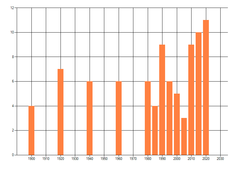 Het aantal atlasblokken (5x5 km) waarin de soort is gemeld binnen een periode van vijf jaar (vanaf 1980) of twintig jaar. Niet gecorrigeerd voor waarnemersinspanning en het aantal doorgegeven waarnemingen kan sterk variëren per periode, dus een trend in verspreiding kan hier niet direct uit worden afgelezen. Het opgegeven jaartal is het eerste jaar van de periode. Bron: gevalideerde waarnemingen uit de NDFF.