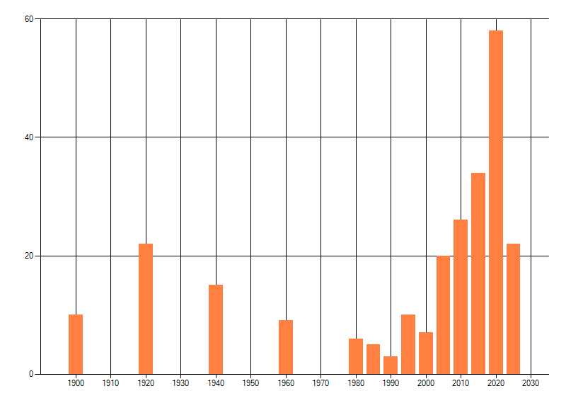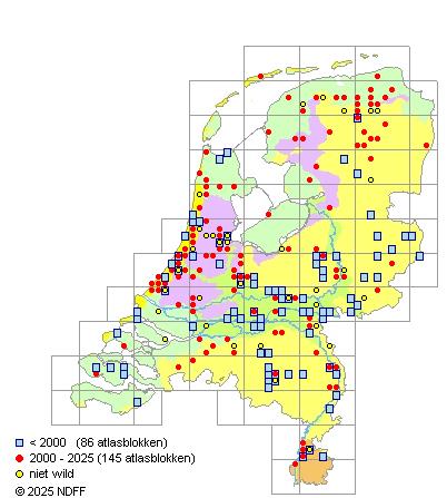 Het aantal atlasblokken (5x5 km) waarin de soort is gemeld binnen een periode van vijf jaar (vanaf 1980) of twintig jaar. Niet gecorrigeerd voor waarnemersinspanning en het aantal doorgegeven waarnemingen kan sterk variëren per periode, dus een trend in verspreiding kan hier niet direct uit worden afgelezen. Het opgegeven jaartal is het eerste jaar van de periode. Bron: gevalideerde waarnemingen uit de NDFF.