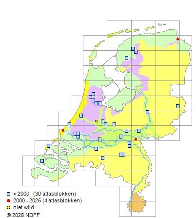 Het aantal atlasblokken (5x5 km) waarin de soort is gemeld binnen een periode van vijf jaar (vanaf 1980) of twintig jaar. Niet gecorrigeerd voor waarnemersinspanning en het aantal doorgegeven waarnemingen kan sterk variëren per periode, dus een trend in verspreiding kan hier niet direct uit worden afgelezen. Het opgegeven jaartal is het eerste jaar van de periode. Bron: gevalideerde waarnemingen uit de NDFF.