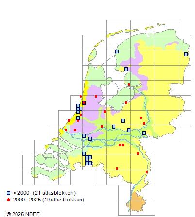 Het aantal atlasblokken (5x5 km) waarin de soort is gemeld binnen een periode van vijf jaar (vanaf 1980) of twintig jaar. Niet gecorrigeerd voor waarnemersinspanning en het aantal doorgegeven waarnemingen kan sterk variëren per periode, dus een trend in verspreiding kan hier niet direct uit worden afgelezen. Het opgegeven jaartal is het eerste jaar van de periode. Bron: gevalideerde waarnemingen uit de NDFF.