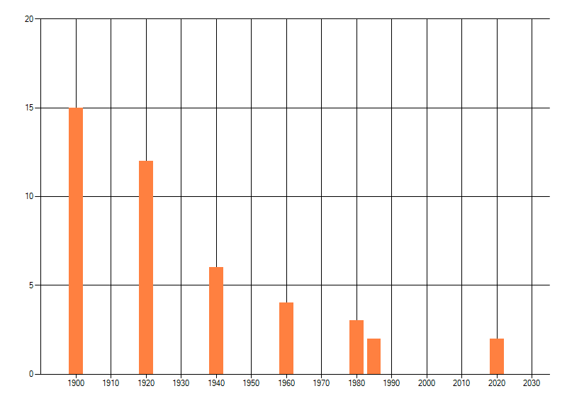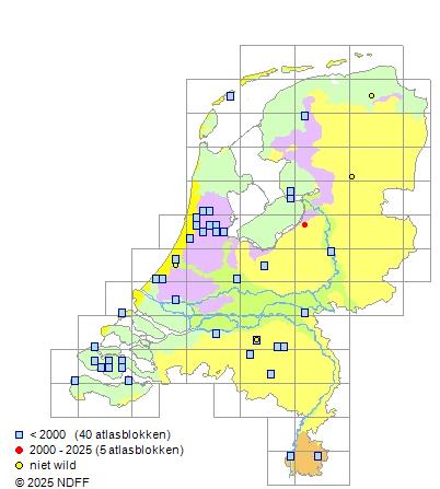 Het aantal atlasblokken (5x5 km) waarin de soort is gemeld binnen een periode van vijf jaar (vanaf 1980) of twintig jaar. Niet gecorrigeerd voor waarnemersinspanning en het aantal doorgegeven waarnemingen kan sterk variëren per periode, dus een trend in verspreiding kan hier niet direct uit worden afgelezen. Het opgegeven jaartal is het eerste jaar van de periode. Bron: gevalideerde waarnemingen uit de NDFF.