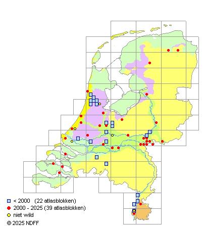 Het aantal atlasblokken (5x5 km) waarin de soort is gemeld binnen een periode van vijf jaar (vanaf 1980) of twintig jaar. Niet gecorrigeerd voor waarnemersinspanning en het aantal doorgegeven waarnemingen kan sterk variëren per periode, dus een trend in verspreiding kan hier niet direct uit worden afgelezen. Het opgegeven jaartal is het eerste jaar van de periode. Bron: gevalideerde waarnemingen uit de NDFF.