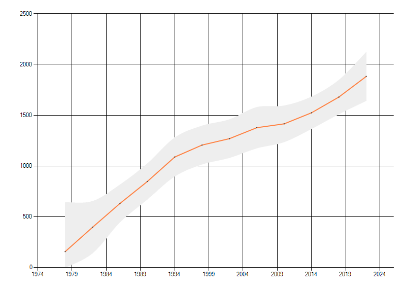 Gemiddelde trend van het aantal kilometerhokken waarin de soort voorkomt, weergegeven als indexcijfer (1975-1978 = 100). De trend is gecorrigeerd voor waarnemersinspanning en geeft de relatieve verandering in het aantal bezette kilometerhokken weer. Voor de berekening worden de data per periode van vier jaar samengenomen. In de grafiek correspondeert ieder punt met het laatste jaar van zo'n periode.