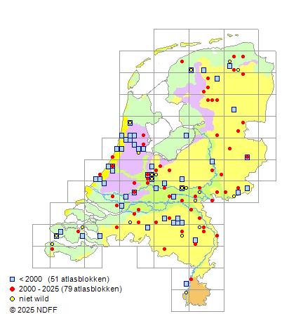 Het aantal atlasblokken (5x5 km) waarin de soort is gemeld binnen een periode van vijf jaar (vanaf 1980) of twintig jaar. Niet gecorrigeerd voor waarnemersinspanning en het aantal doorgegeven waarnemingen kan sterk variëren per periode, dus een trend in verspreiding kan hier niet direct uit worden afgelezen. Het opgegeven jaartal is het eerste jaar van de periode. Bron: gevalideerde waarnemingen uit de NDFF.