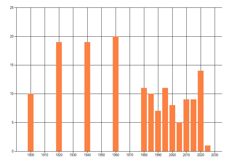Het aantal atlasblokken (5x5 km) waarin de soort is gemeld binnen een periode van vijf jaar (vanaf 1980) of twintig jaar. Niet gecorrigeerd voor waarnemersinspanning en het aantal doorgegeven waarnemingen kan sterk variëren per periode, dus een trend in verspreiding kan hier niet direct uit worden afgelezen. Het opgegeven jaartal is het eerste jaar van de periode. Bron: gevalideerde waarnemingen uit de NDFF.
